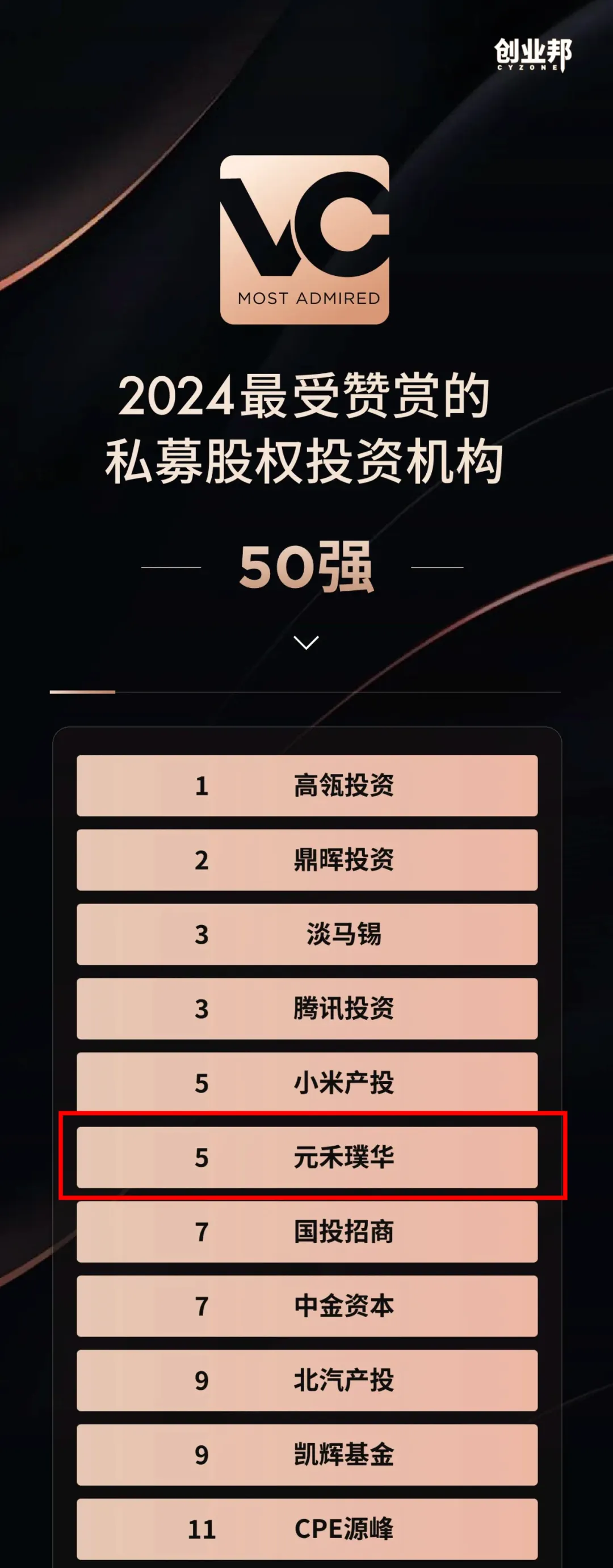 喜讯!元禾璞华荣获"创业邦2024最受赞赏私募股权机构"第5名